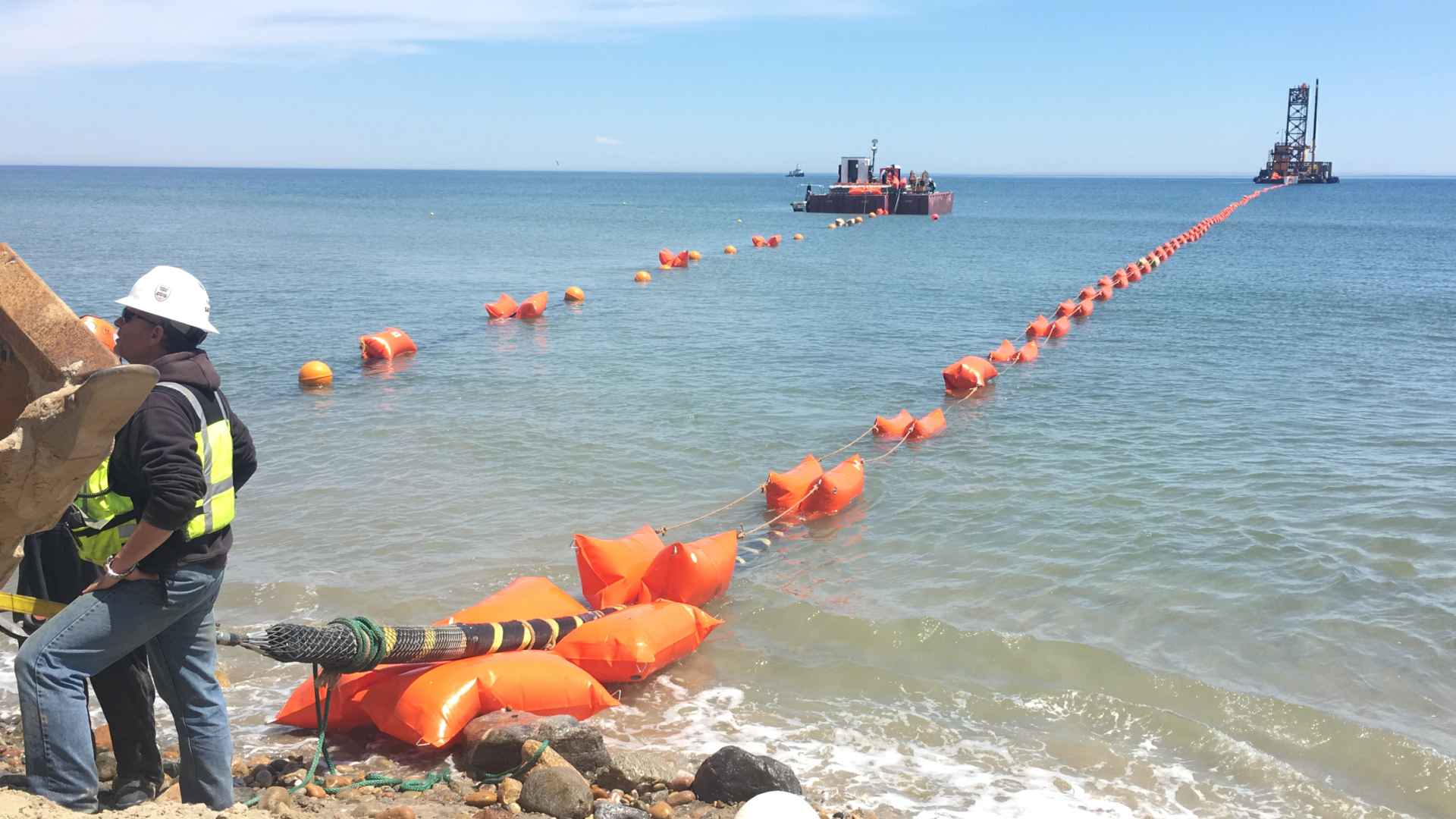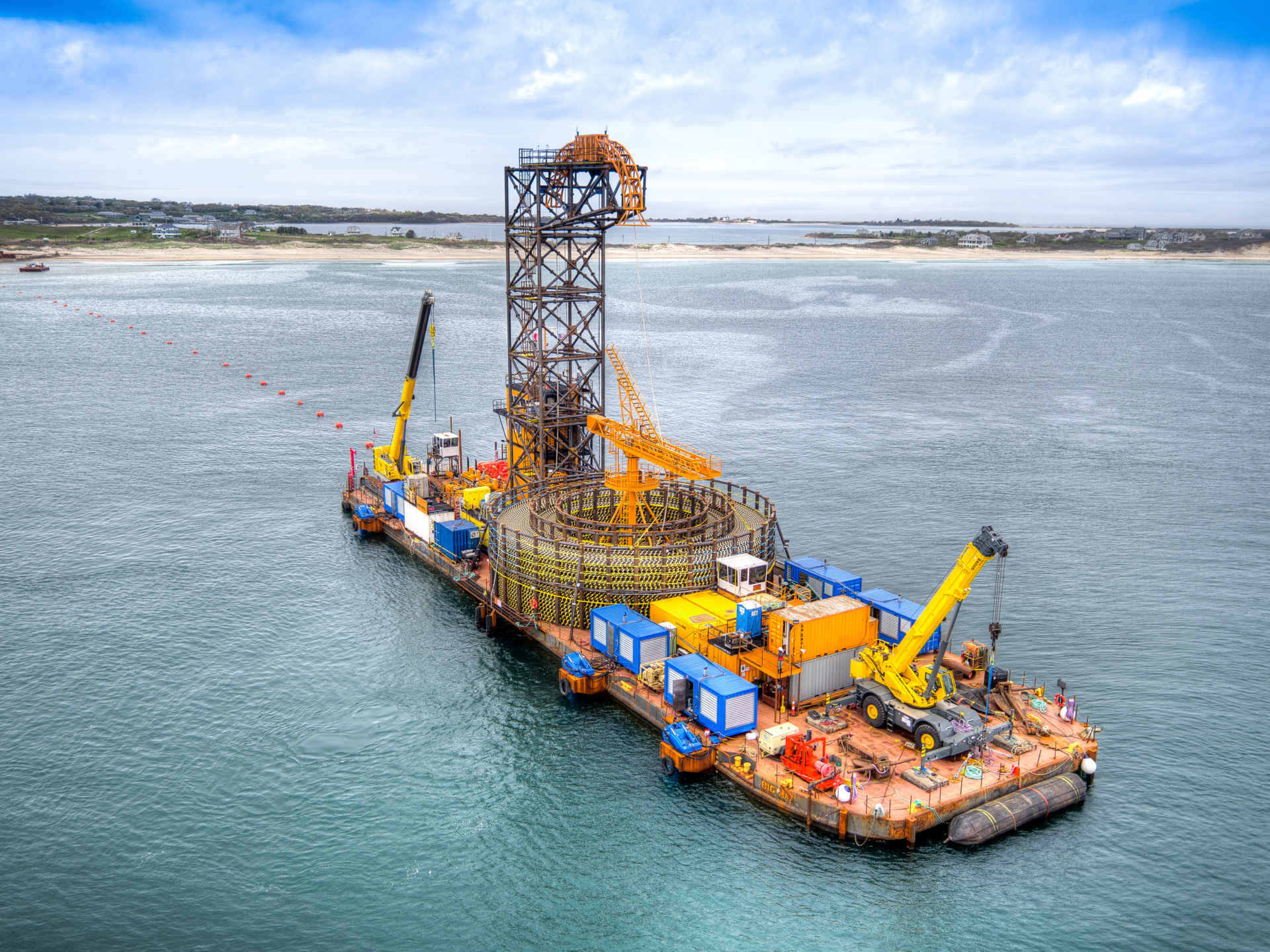 The Durocher Marine installation team designed and constructed a self-propelled, USCG approved, Dynamic Positioned Barge (DP-2) to safely and precisely lay and bury the subsea cable installations. The system utilized six 500 HP thrusters for propulsion that were mounted on a 260-foot by 72-foot by 16-foot ABS barge. Mobilization of the cable lay vessel began in January of 2016 in Florida and was completed in April in Rhode Island. The total 28 miles of cables weighed 3,400 metric tons and were coiled in a holding tank built on the deck of the lay vessel. The installations began in May with the export cable and ended in July of 2016 with the installation of the array cables. The subsea cables were all installed successfully and buried to six feet along the cable lay routes.
